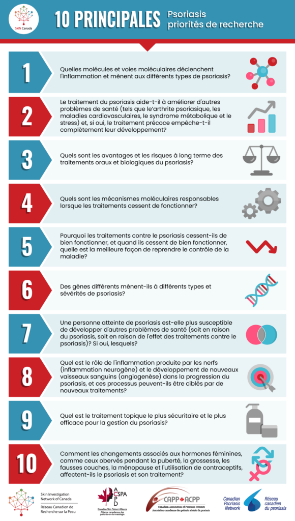 La communauté des patients atteints de psoriasis au Canada a collaboré avec des chercheurs et des fournisseurs de soins de santé pour dresser la liste des dix principales questions de recherche auxquelles sont confrontées leurs communautés de patients atteints de psoriasis. L’ACPP a collaboré avec le Skin Investigation Network of Canada (SkIN Canada) et d’autres organisations de patients pour rejoindre les patients et les soignants touchés par le psoriasis afin qu’ils puissent nous dire quelles étaient, selon eux, les questions les plus importantes auxquelles la recherche devait répondre.
